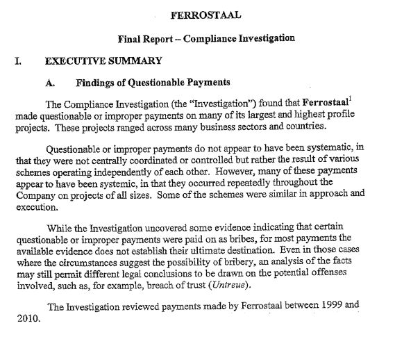 Ferrostaal Internal Probe Finds ‘Questionable’ Payments: An internal investigation of Germany’s Ferrostaal AG found evidence of “questionable or improper” payments all over the world, though they weren’t “systematic.” A partial copy of the report (pdf), conducted by Debevoise & Plimpton LLP and dated April 13, 2011, was posted anonymously on Thursday to the website Wikigreeks.org. It reviewed payments made between 1999 and 2010, and was stamped “privileged and confidential” and “attorney-work product.”