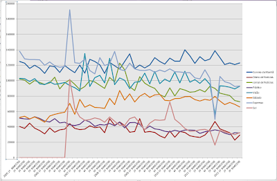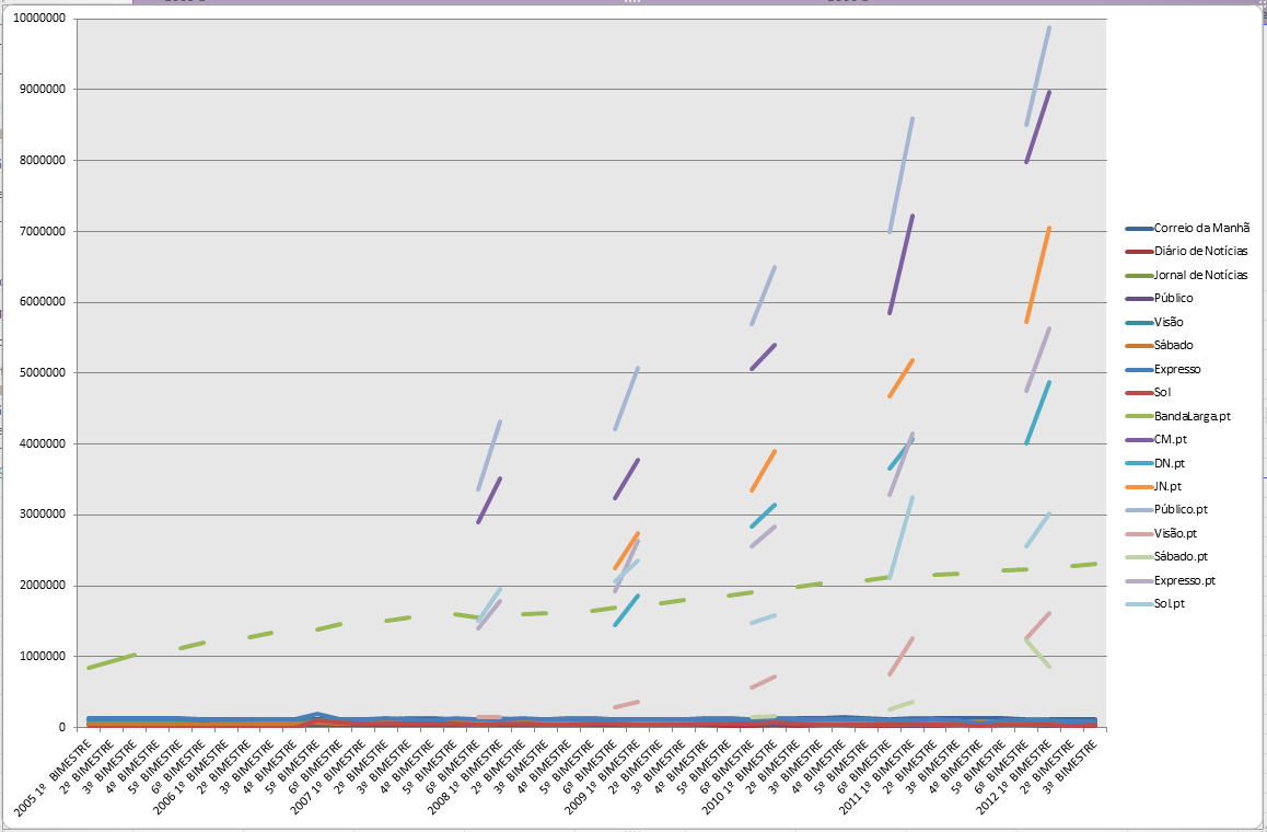 Entretanto, a banda larga esteve sempre a subir, tal como os acessos a estes media online desde 2007 (os números são dos acessos/visitas e não das "page views", porque vários sites informativos dividem uma notícia em várias páginas ou fazem refrescamento das páginas enquanto os utilizadores lhes estão a aceder, com o mesmo objectivo batoteiro de aumentarem o número de acessos):