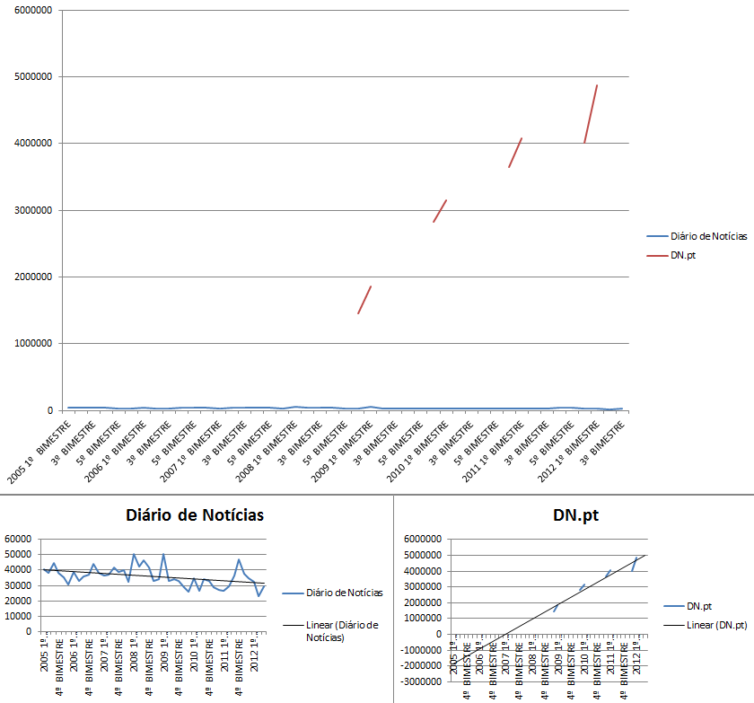 Há duas excepções, curiosamente do mesmo grupo (Cofina). O Correio da Manhã continuou a subir em vendas (mesmo após o fecho do 24 Horas no terceiro bimestre de 2010) mas também no online:
