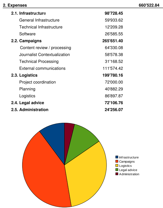 For journalistic processing, especially the contextualisation of  received materials and additional explanation/highlighting of background and contexts, journalists have been engaged and their effort financially compensated. In 2011 a total number of six journalist have been hired in this area.